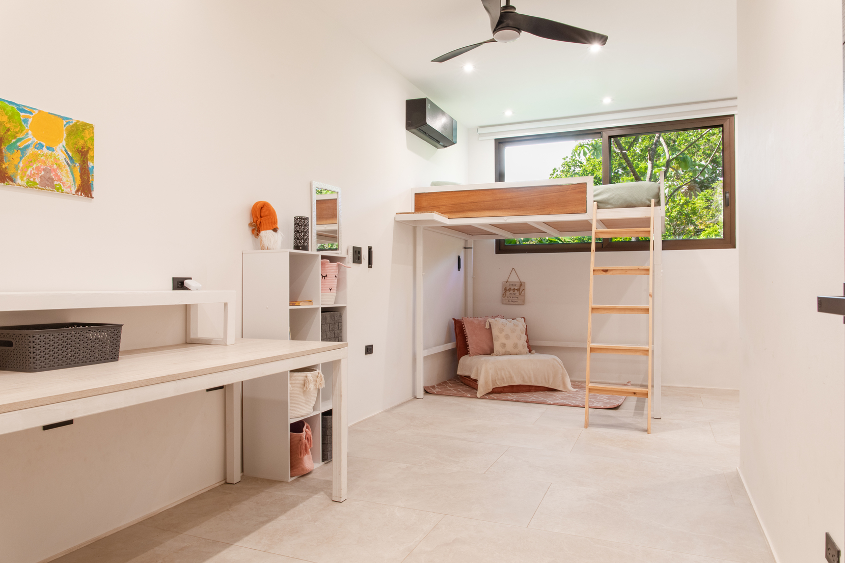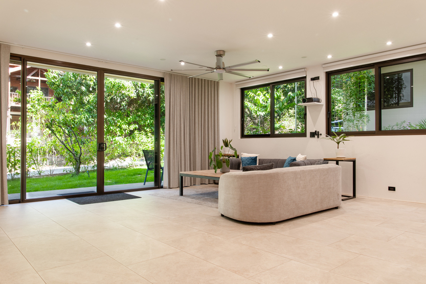 - All living areas feature ceiling fans, split AC units, oversized windows with jungle views, and dimmable LED lighting.